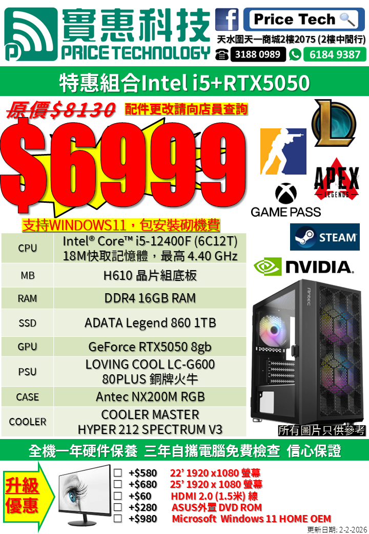 主頁 電腦砌機組合 特惠組合 Intel i5 + RTX5050